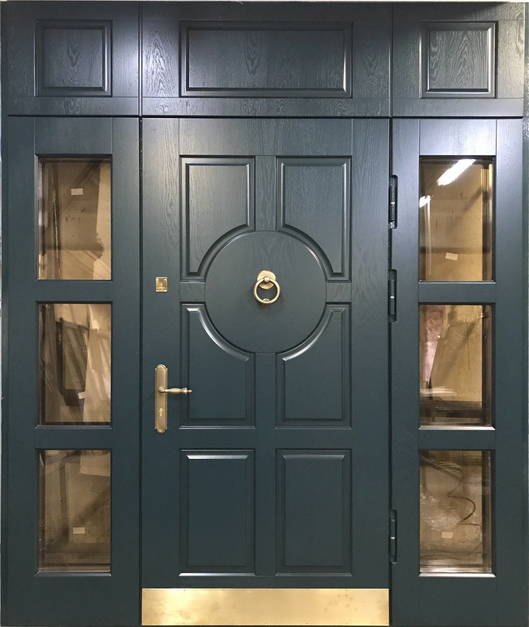Парадные двери относятся к изделиям премиум-класса. Изготавливаются такие модели из металла толщиной не менее 2,0 мм, конструкция усиливается ребрами жесткости. Основной фактор, делающий парадные двери таковыми – их внешняя отделка. Для декора этих дверей, как правило, используют массив дуба, ясеня или сосны, натуральный шпон, корабельную фанеру, МДФ-панель, покрытую атмосфероустойчивой пленкой Винорит (VINORIT). Декоративные вставки из антивандального стекла, с применением элементов ковки, рисунок, который будет сочетаться с рисунком решеток на окнах, придаст коттеджу неповторимый внешний вид. Можно декорировать дверь витражным узором – и ваш дом заиграет яркими красками. По конструкции парадные двери могут быть как одностворчатыми, так и двустворчатым. При достаточной высоте проема, можно изготовить входную группу с декоративной вставкой сверху – прямоугольную или в виде арки. Терморазрыв в конструкции парадной двери сохранит тепло в доме, и предотвратит промерзание и кондедсирование двери в холодное время года, при этом не требуется обустройство в доме холодного тамбура.
