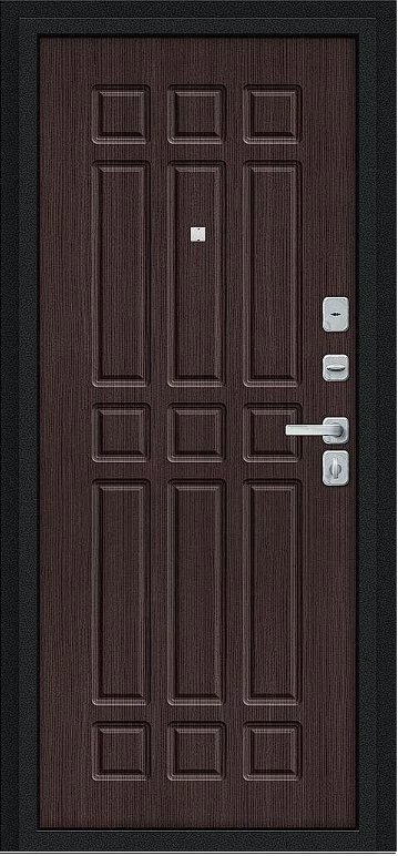 Надежная входная Дверь Браво Мило МФ/BChrome Букле черное/Букле черное/Wenge Melinga премиум класса по цене 33 163 руб. Большая толщина стали защитит от проникновения в ваш дом, квартиру или коттедж. Используется очень качественная фурнитура: замки, цилиндры, ручки, защелки. Покрытие и отделка двери изготовлено под внимательным контролем производителя. Дверь имеет долгий срок службы и гарантию.