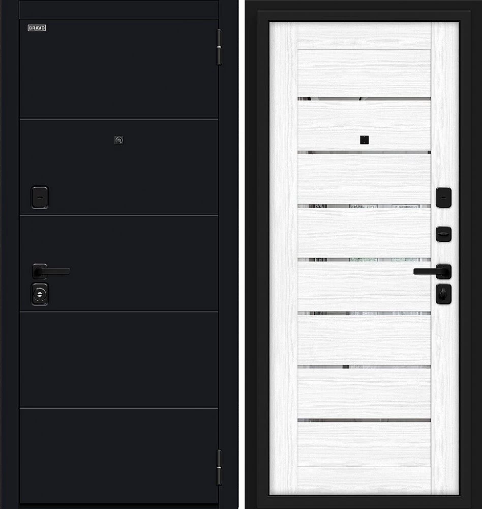 Надежная входная Дверь Браво Прайд Total Black/Snow Melinga премиум класса по цене 39 513 руб. Большая толщина стали защитит от проникновения в ваш дом, квартиру или коттедж. Используется очень качественная фурнитура: замки, цилиндры, ручки, защелки. Покрытие и отделка двери изготовлено под внимательным контролем производителя. Дверь имеет долгий срок службы и гарантию.